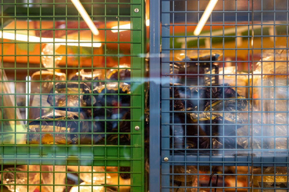 Όλα τα μεταλλικά ράφια, οι πάγκοι, τα κρεμαστά και τα πλέγματα έγιναν σε διάφορες διαστάσεις και μελετήθηκαν με βάση τα εμπορεύματα και τη ζωντανή λειτουργία της αγοράς… Τα κάναμε σε ρόδες και σταθερά, ενώ η βαφή είναι ειδικής αντοχής στην υγρασία και στην καταπόνηση…»